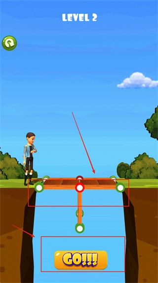 4、进入第2关后,桥上装饰着红绿两色的圆球。点击黄色的“GO!!!”按钮即可开始游戏,通过重置按钮来调整桥的结构,从而协助蓝衣角色平安过桥。