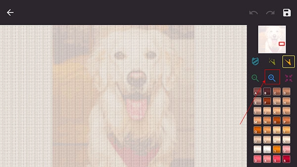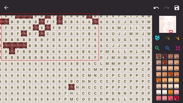 绣布的右上角设有整幅作品的预览区域,旁边排列着撤回、重做的箭头图标,以及保存按钮。好啦,介绍就到这里,大家可以自己去体验啦~