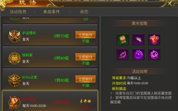 每天上午10点到晚上10点,等级达到70级及以上的玩家,可以前往白日门区域,找到名为黑市商人的NPC,通过与他交互来获取藏宝图道具。