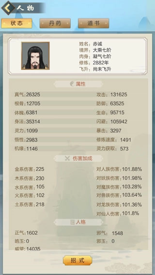 ③魔界:当邪气值满1000后,缴纳1万灵石即可进入。在魔界中,修士既能吸取他人修为,也能抢夺对方灵石,且只要自身实力强于对方,便可随意将其驱逐出界;不过每日吸取或抢夺的次数最多为5次。魔界奉行实力至上的法则,实力不足者最好避免踏入。 2、①结丹:需消耗1千万修为,同时花费2个小时进行转化,成功后可获得50点属性,属性类型为随机分配。