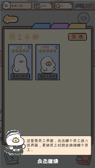 点击柜台处的鸭子,即可进入员工界面,玩家能够自定义调整员工的岗位安排。