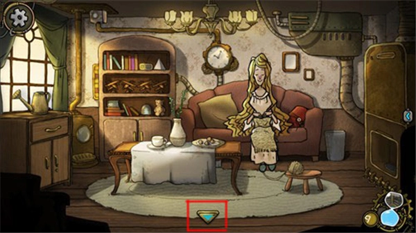 在客厅与母亲发生了一些情节互动后,母亲让我们把刚做好的曲奇饼送到楼上给妹妹,于是我们点击屏幕下方的返回按钮,回到了大厅。
