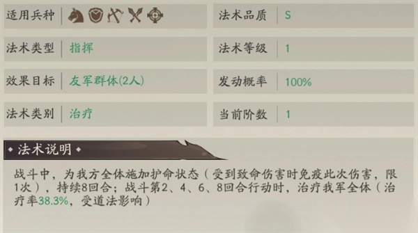 固有法术“风雨莫测”必然触发效果:为全队施加持续8回合的护命状态(受致命伤害时免疫1次),且在8回合内的偶数回合为全队治疗。该法术对长线战斗阵容增益显著,护命状态应对高爆发阵容时效果突出。法术“以屈求伸”可降低友军所受伤害。上述两个法术均在战斗准备阶段释放,因此不会受到孔宣固有法术的影响。“乌云压顶”能解除友军负面状态并进行治疗。这套法术组合整体侧重恢复与保护,可有效保障主将输出。