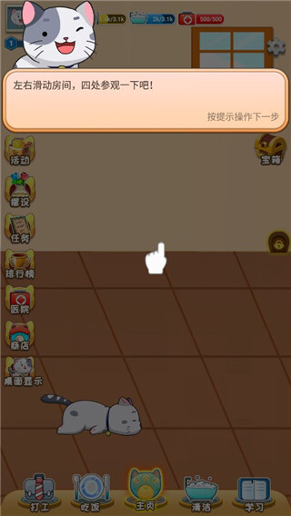 2、这里有一只超萌的小猫咪正等待你的领养,你需要给猫咪安排干活、打工之类的任务,以此提升与猫咪的亲密度。
