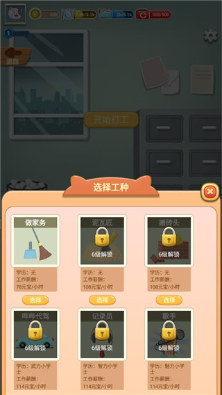 7、再选择工作的时长,时长也多赚的金币越多;