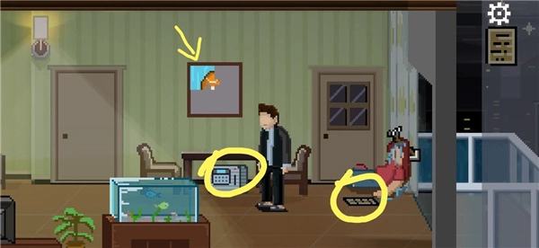 按下墙上那个白色机关,它的上方排列着一排按钮,下方则有四个提示。按照提示将上面四个柜子的把手全都转到左边,就会有钥匙掉落下来。点击妻子后,会得到“凶手在右边”的提示,那我们就继续向右行进。