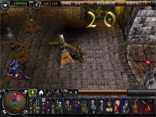 本关的敌方英雄会和你同步发展,等他攒够七万黄金就会发起进攻,不过你有的是时间,可以让怪物们慢慢升级。新增的建筑是储金室和工厂,工厂里能生产木门与火炮。北边有一条河流,周边藏着大量黄金,尽管敌人在那布置了不少火炮,但不用理会——派小鬼去挖黄金的同时,让怪物们安心升级就行。要是资金充裕,还可以在地城北侧造几门火炮。过不了多久,敌方英雄就会在手下的簇拥下向你发起攻击,可他很快就会明白这是自不量力,而且转眼就会倒在血泊中,再也没机会意识到自己的失败了。