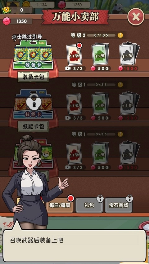 商店购物玩法:消耗钻石在商店中选购装备卡、技能卡以及伙伴卡包,以此提升角色的战斗力。
