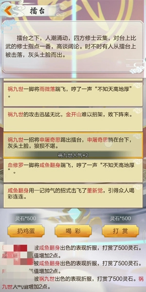 其他提升人气的途径。除了连胜之外,打赏与喝彩同样能增加人气,不过扔鸡蛋会给他人减少人气(在此强烈不建议采用这种损人利己的做法,修仙重在修心,切勿为了些许小利就去损害他人的利益)。每个账号每天可进行5次打赏(免费且无需花费)、5次喝彩(每次需消耗500灵石)、5次扔鸡蛋(每次需消耗500灵石);每次打赏能增加2点人气,每次扔鸡蛋会减少2点人气,每次喝彩可增加1点人气。