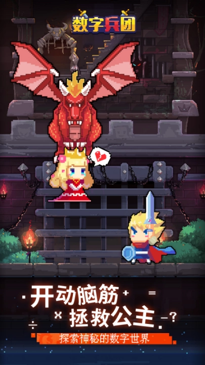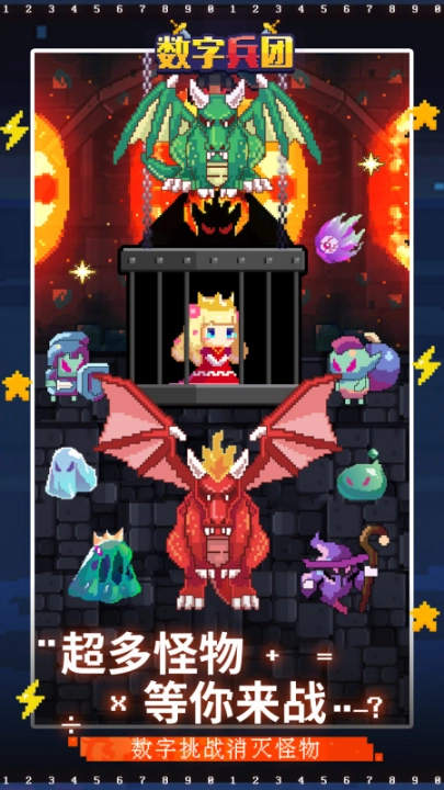 一位美丽的公主落入了恶魔的魔爪,作为公主数字兵团的团长,你毅然踏上了解救公主的征途!那些翻山越岭的艰辛、没日没夜的奋战,乃至最终与终极boss的决战……在《数字兵团》里,这些都不存在!这里所有的怪物都得靠数字才能打败,你唯一的武器就是自己的智慧,加减乘除则是你最得力的伙伴,能否成功救出公主,全看你的运算能力如何啦!