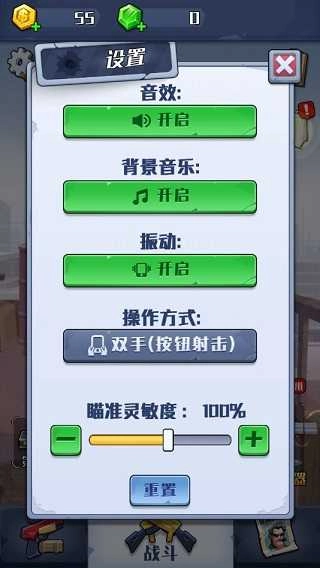 此外,在这里你还可以调整瞄准的灵敏度设置,以及开启或关闭音效和背景音乐。