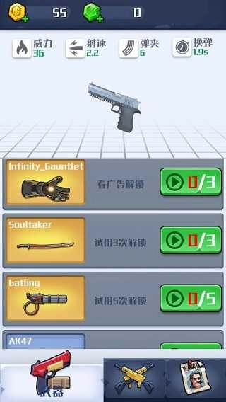 每次成功通过关卡都会解锁新武器,当进度条填满后,就算没有手动解锁,你也能获得新的武器使用。