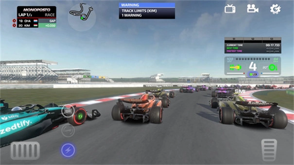 6、比赛开始后,将与21名赛车手同场竞技,左侧控制转向,右侧操作油门和刹车,如不习惯默认操作方式,可在设置中调整操控模式。