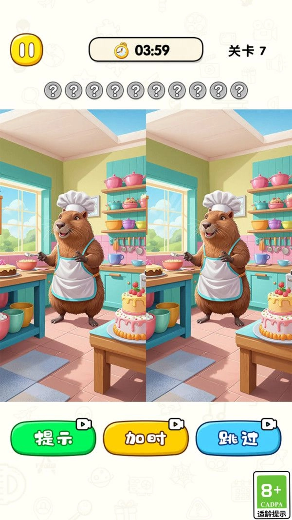 3、游戏过程中遇到阻碍时,可借助辅助功能;若难以发现差异或剩余时间不够,可通过提示、加时或跳过按钮来帮助自己完成当前关卡。