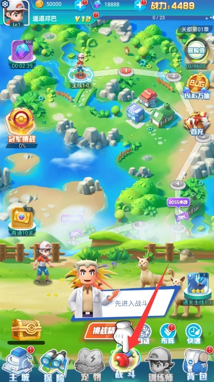 进入游戏后点击“战斗”按钮进入挑战界面,挑选合适的关卡开启获取金币的旅程。