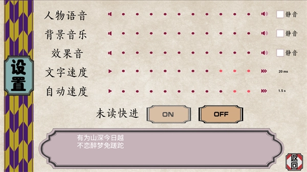 点击设置,这里可以调整游戏的音量以及文本速度;