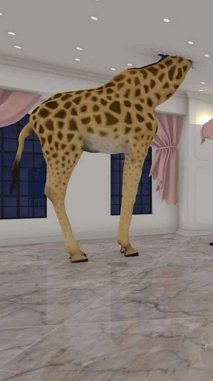 头捅破天花板的长颈鹿。