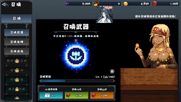 武器、盾牌、戒指这三样,就算抽满33次也只有300宝石的奖励,其他类型的召唤花费都更高。这三者恰好关联着基础攻击、防御穿透率、体力、防御率、普攻伤害和攻击速度这些核心属性,建议开局不用迟疑,直接持续抽取,把这三件装备都抽到SR+品质就行,大概100A以内就能完成这个目标。
