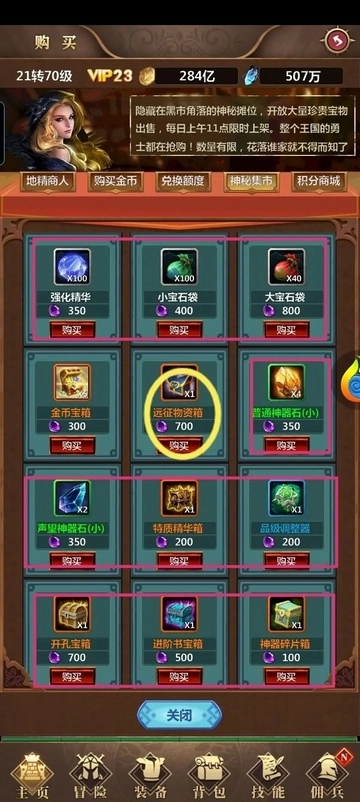 在TAP平台复制第9天的签到码,可领取25万钻石。11点准时进入游戏,初始等级为1级,同时会有50000钻石作为初始资源。点击左上角名字旁的弓箭图标,选择兑换礼包并输入兑换码。在黑市和神秘集市中,建议按照强化精华、圣器碎片、圣器灵石、大宝石袋、进阶书宝箱、小宝石袋、神格碎片、灵魂碎片、特质精华、开孔宝箱、普通神器石、声望神器石的顺序进行购买。若还有剩余钻石,可考虑购买重铸之尘和佣兵碎片箱。(图片红圈标注的是新区推荐物品,黄圈标注的是远征物资活动周推荐物品)