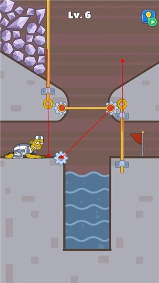 5、第六关,先将中间的横杆打开,再将上面的落石放下来堵住水池就可以通过了。