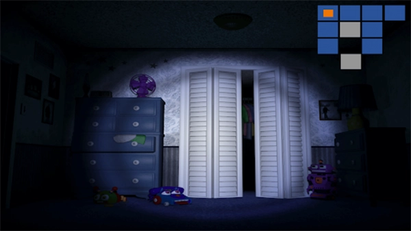 电力控制室:玩家需开启电力维修面板以重启电力系统,按住相应按钮即可操作。在此过程中,欢乐弗雷迪会尝试接近玩家,右上角会显示危险等级提示。