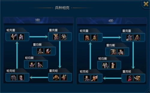 大致上,每个英雄和兵种都有自己的生命值,护甲,对重甲和对轻甲的伤害以及攻击距离和攻速,英雄通过装备和等级来提升,兵种则可以通过铭文和英雄来提升,铭文等一会在介绍根据英雄来提升就是上面所说的,兵种和英雄都分为轻甲和重甲,同时分为轻克轻,轻克重,轻均衡,重克重,重克轻,重均衡,轻克轻即为自身是轻甲而对轻甲的伤害较高对重甲伤害较低,其他同理,均衡即为对重甲轻甲伤害相同,不过具体每个英雄兵种的还是要看具体数值因为比如虽然说是重克轻但对重甲伤害同样不弱,兵种大致分为三阶,具体点击备战之后右上角就有总览可以看,分为三阶是因为同类型兵种也有强弱之分。