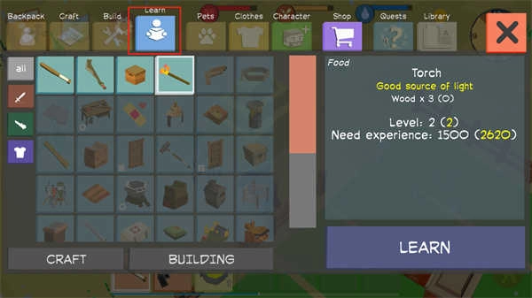 玩家可以点击“Learn”按钮来了解部分高级道具的制作方式。