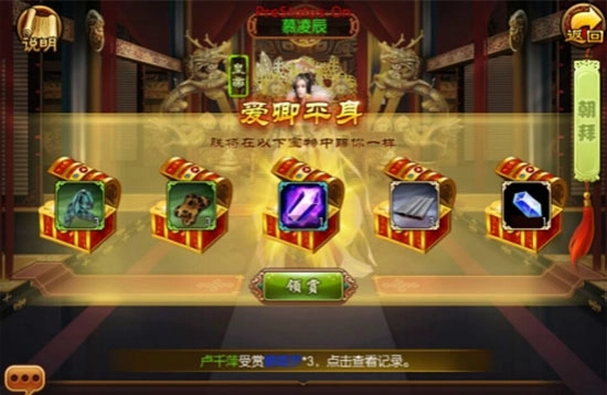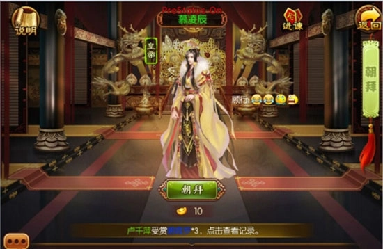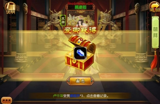 熹妃传每天最有机会见到皇上的时候,就是朝拜的时候,每次朝拜可以获得主上的赏赐。赏赐可能会有珍宝,元宝赏赐有更高的机会获得珍品。一旦玩家受赏,奖励将重新刷新,有需要的小主一定要好好把握机会,每一次都可能是你成为凤凰的机会。皇帝、皇后可以领取贡品,每天朝拜出现的珍品越多,皇帝、女皇收到的贡品也就越多。皇帝、女皇每天有权更换一次珍品。