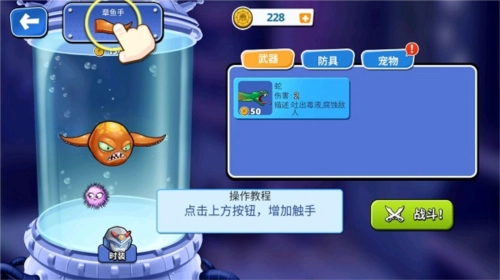 战斗引导完成后回到主界面,点击图里标注的地方就能增加触手,触手数量越多,获胜的几率也就越大!