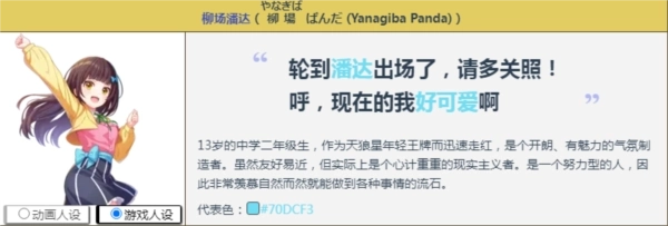 虽然散发着独特的存在感,但本人却没怎样在意,被称为是神秘的角色。实际上,她非常憧憬青梅竹马柳场潘达。