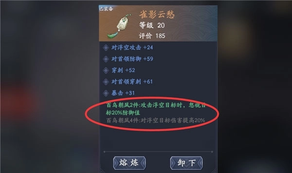 3、百鸟朝凤:套装属性会对浮空的目前造成更多的伤害,那么就需要搭配合适的武器已经绝学了。是比较常用的进攻辅助类的套装。