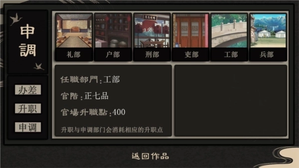 一、爱民如子,忠君爱国的朝廷官员:官场六部系统,随机分配部门,户部管钱,刑部查案,礼部科举,吏部掌品,工部建设,兵部练兵。是做一个为国为民,青史留名的好官;还是黑了心肝,遗臭万年的jian臣。