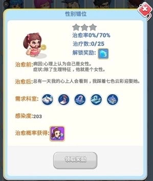 每种不同病症都有治疗科室的需求,在病人图鉴中可以清楚的查看,升级对应的科室将能大大提高病症的治疗效率。治疗每种病症成功后将获得经验、金钱以及特殊装备奖励,在病人图鉴中可以对每个病症的治疗奖励进行全面了解。
