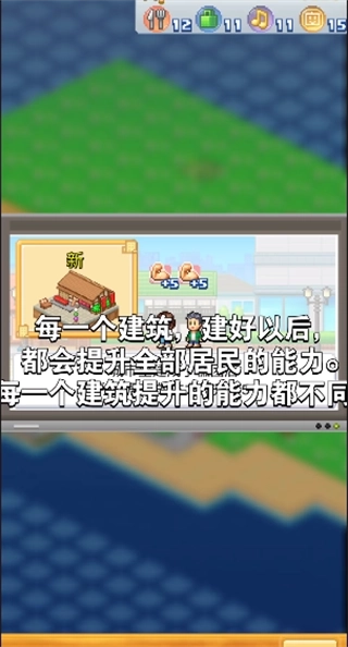 6、每一个建筑建好以后都会提升全部居民的能力,每一个建筑提升的能力都不同。