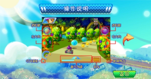 游戏中玩家需要驾驶自己的赛车在不同的赛道上行驶,本作中共拥有三名个性迥异的主角和3辆各具特色的赛车可供玩家选择,不同的角色对应的赛车性能也大不相同,玩家可以根据喜好进行选择。