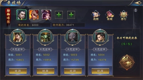 竞技场作为传统的PVP玩法,是玩家间切磋和检验实力的一个重要渠道。玩家可通过对仙将的阵位、阵形调整来获取竞技场的胜利,提升自己的名次,以获得更好的奖励。