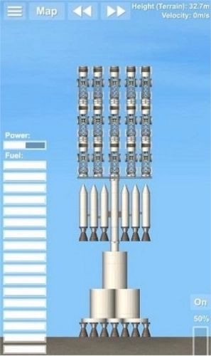 这个火箭是比较简单的火箭样式,里面搭载了一个小型的卫星,超长的燃料箱以及两个辅助的燃料箱提供更多的燃料补给