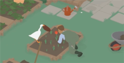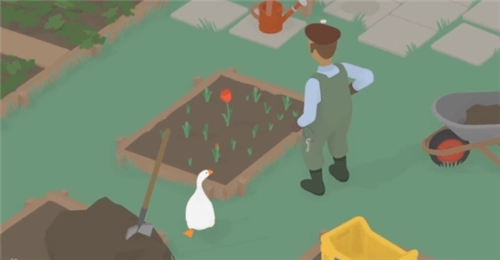 1、首先,鹅作剧中玩家在园丁的花园里能看到一朵花,我们将花从土里拔出来后放在地上;