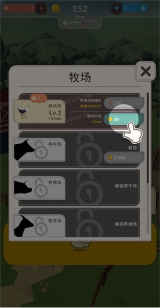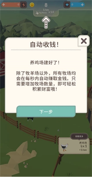 1、除了牧羊场以外,所有牧场均会在每秒内自动赚取金钱。只需要增加牧场数量,即可轻松积累财富。