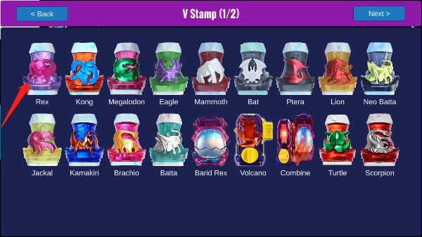 2、进入罪恶印章界面,可以看到所有的变身道具印章都在这个页面,我们选择一个雷格斯Rex男主的粉色暴龙印章。