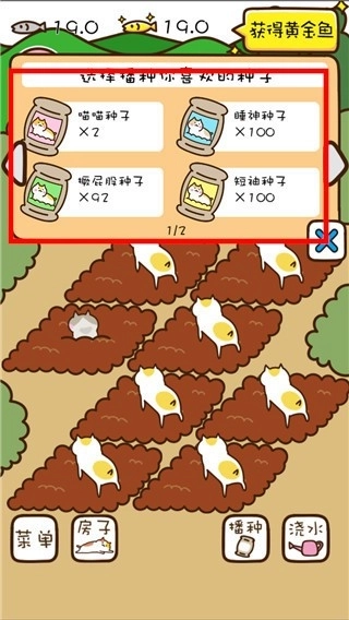 1,开局就可以领取小鱼干,看广告还可以领黄金鱼。你可以可以去商店购买猫咪种子,只需要去田地种下种子。