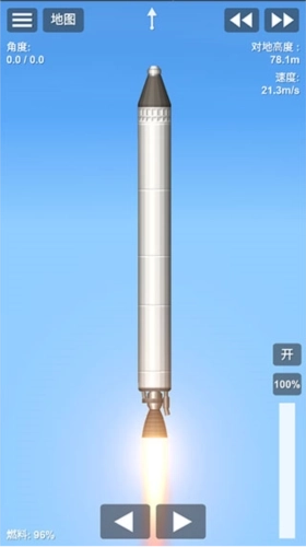 4、起飞后五个燃料一起点燃,中间的燃料会先用完,用完后将其丢掉,可以降低火箭的重量;