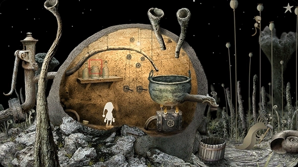 3、小人回到中间的房间,转动墙上中间的两个机关。点击右边的虫子,跳到最右边的树上,再点击跳到最左边的树上,粉撒入房间的锅子。点击房外左边向水泵一样的机关几下,水流进中间房间的锅子。