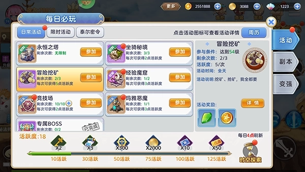 3、日常任务:冒险挖矿和经验魔窟分别在54级和65级解锁,提供了众多的随机性与趣味性,同时也是获取经验和奖励的关键渠道。