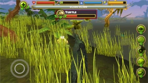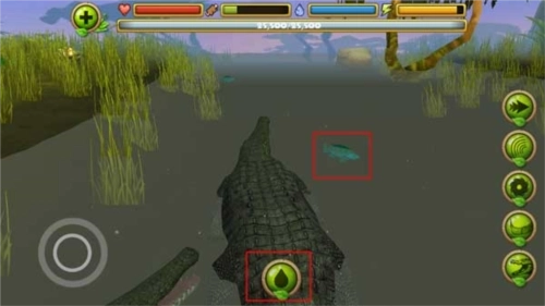 2、当鳄鱼进入到水中是会自动出现一个按钮,你需要捕食为你补充能量,需要小心附近其他的动物的侵害。
