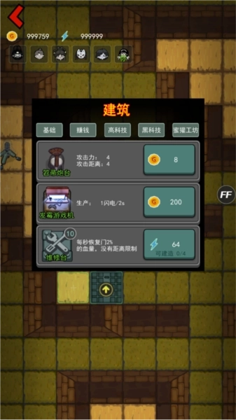 5、然后躺平赚钱,利用金币来升级购买各种建筑,抵挡红衣鬼,不同建筑拥有不同功能,玩家需要合理搭配组合;
