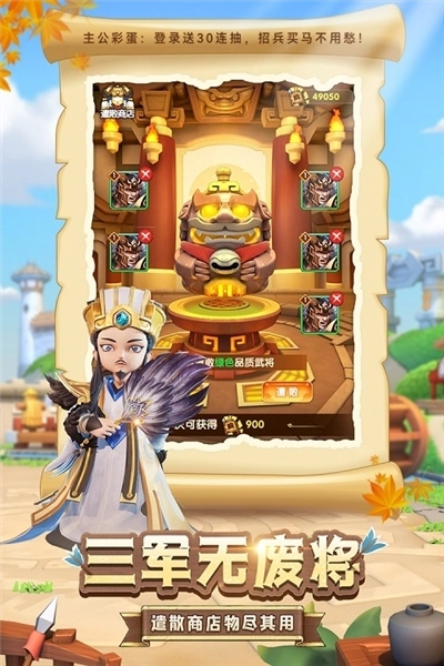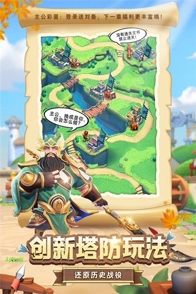 游戏以塔防和卡牌为主要玩法,操作简便,轻松掌握;游戏提供近百位武将通过自由组合、自由培养,最大限度发挥每位武将的极致战力,运筹帷幄,决胜千里!