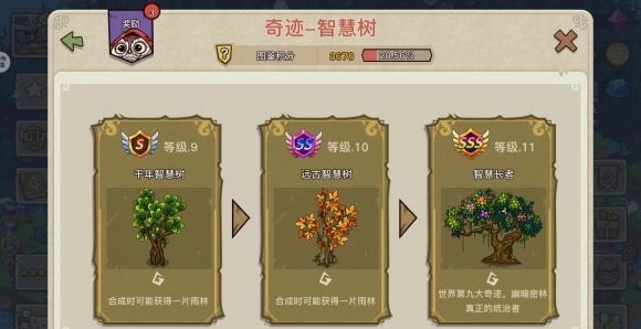 4、四级以上的智慧树可以采集出树叶了,用合成七级以上的智慧树有几率出雨林,目标是刷到最少一个一级雨林。