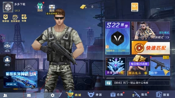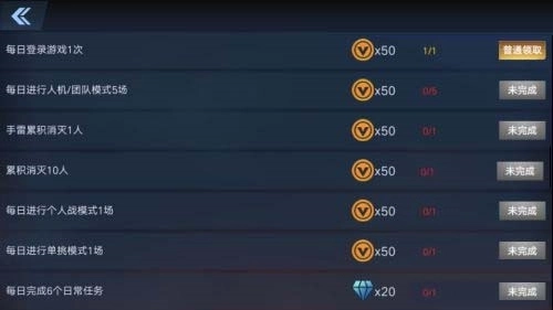 2、每天完成特定任务就能领取奖励,像每日人机对战、团队对战、用手雷累计消灭1名敌人等任务,都能获得金币。