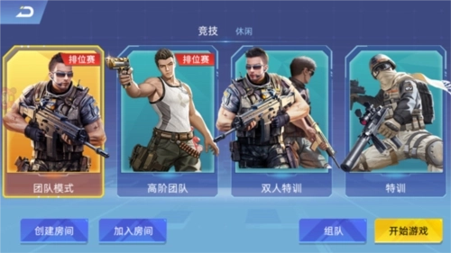 1、启动全民枪神边境王者游戏,点击右侧的模式切换按钮,当前提供团队模式、高阶团队、双人特训等竞技类玩法,同时也包含休闲玩法;